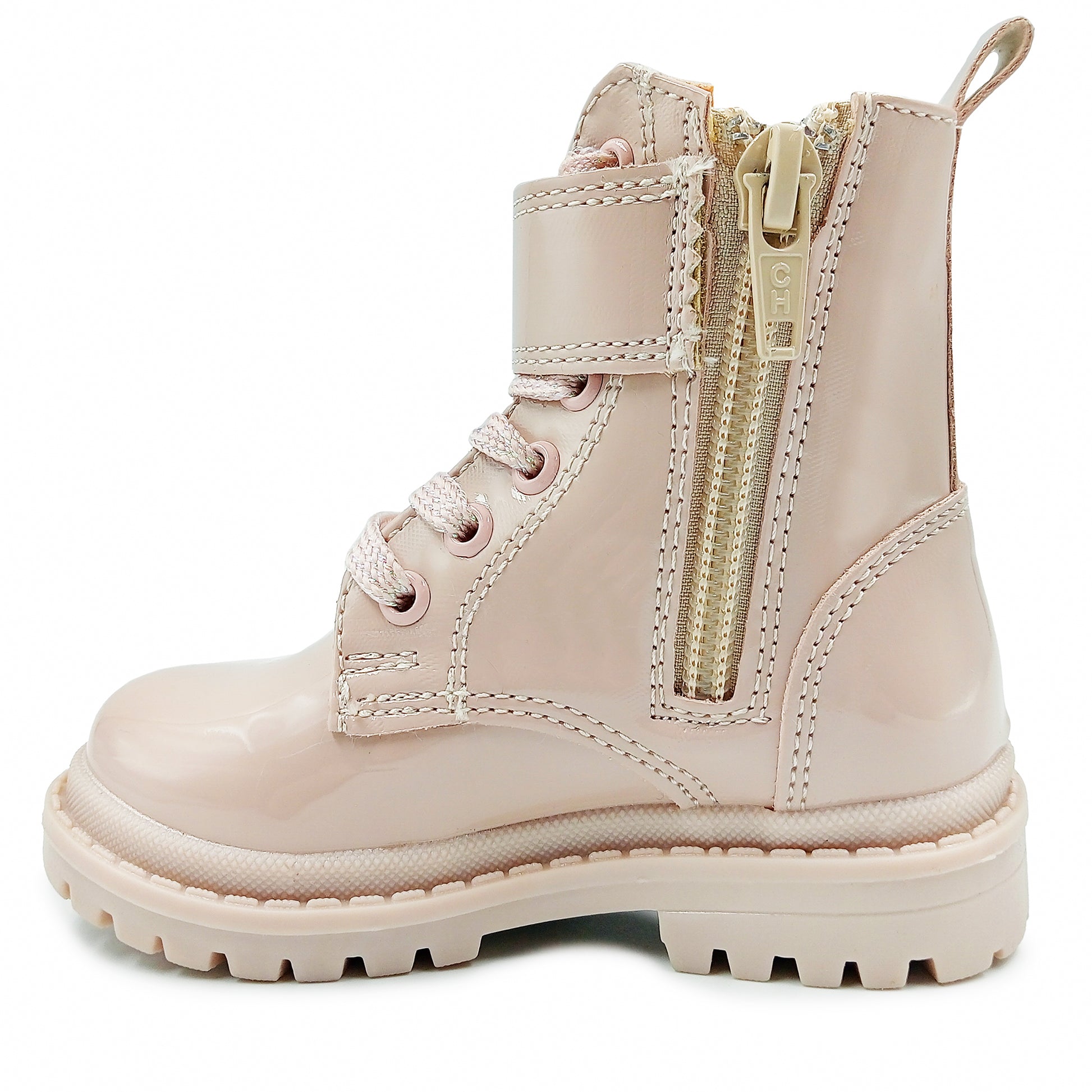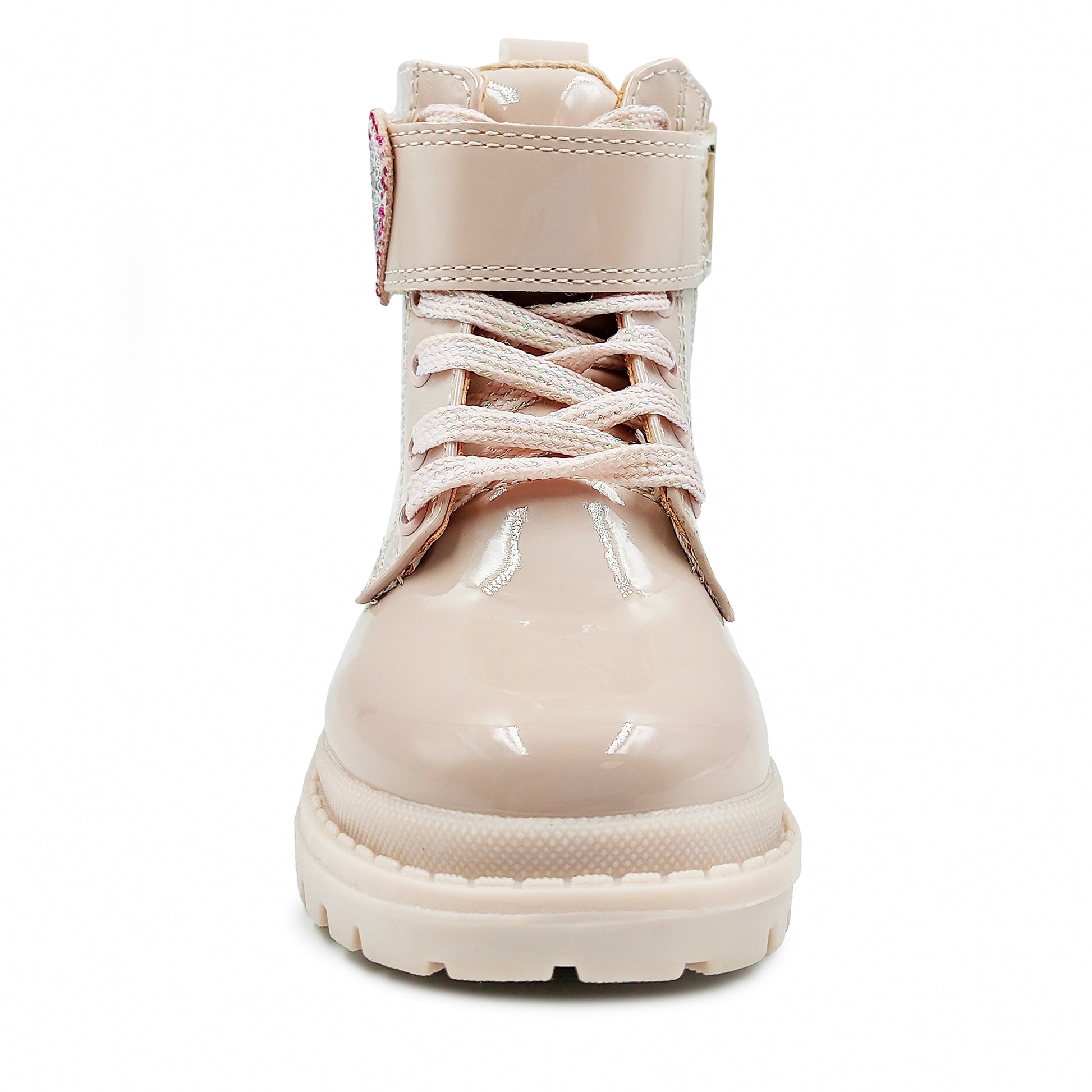 Botas marca ANBADA para niña material de charol en color beige, con detalle de corazon de pedreria, agujetas y velcro mayor seguridad para las niñas