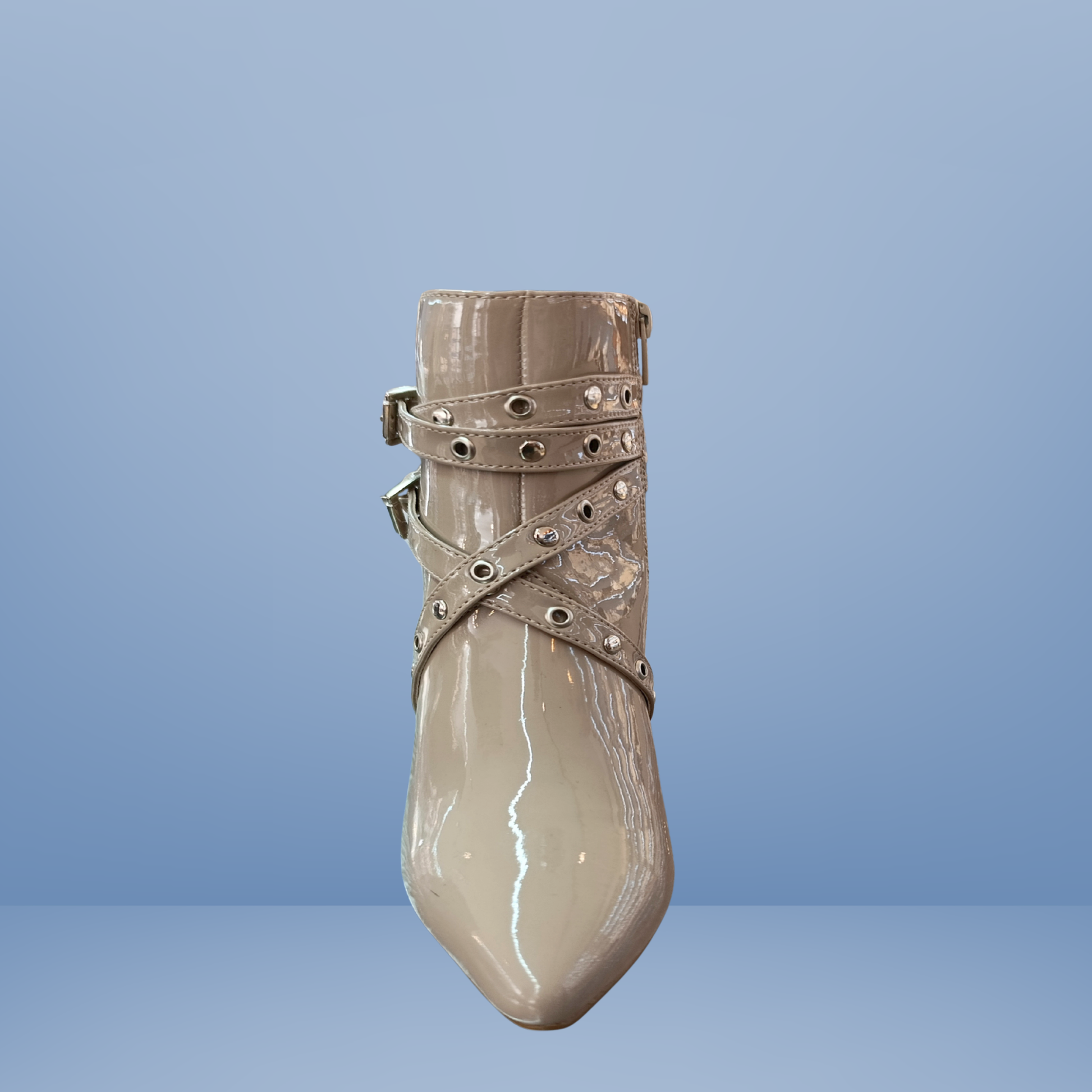 Brillo que impone. Botín tipo charol con detalles de hebillas y estoperoles para un look audaz.