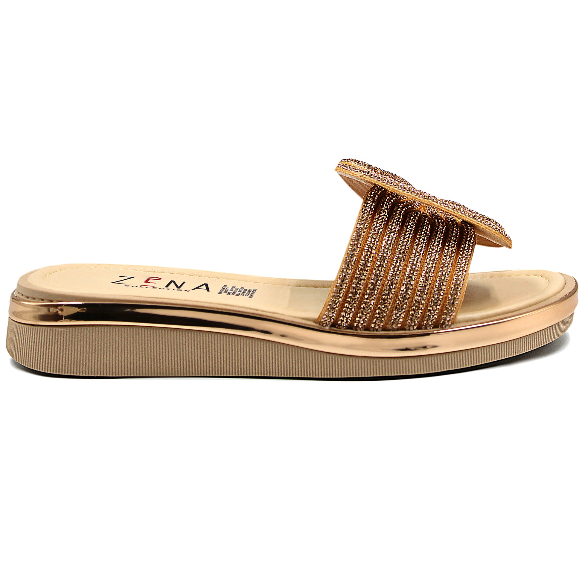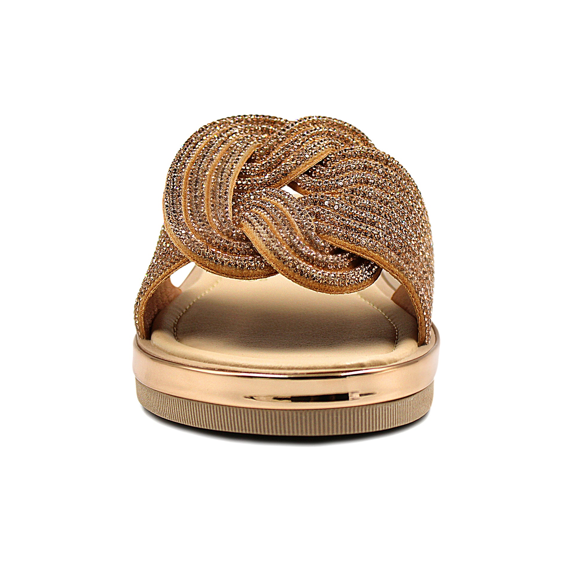 Brilla con este calzado versátil y cómodo en color oro rosa con pedrería.