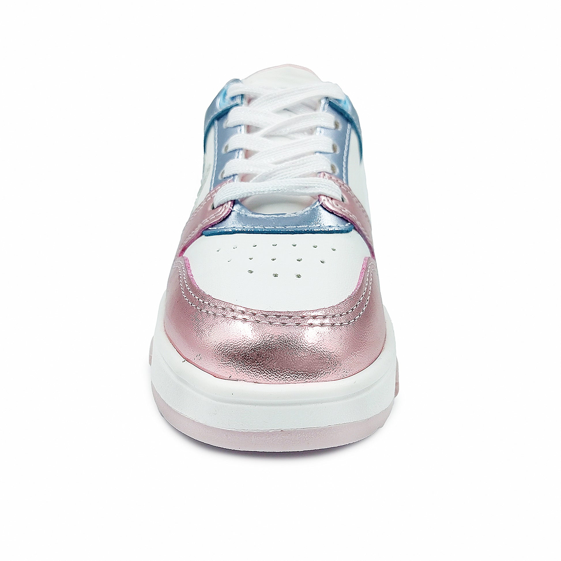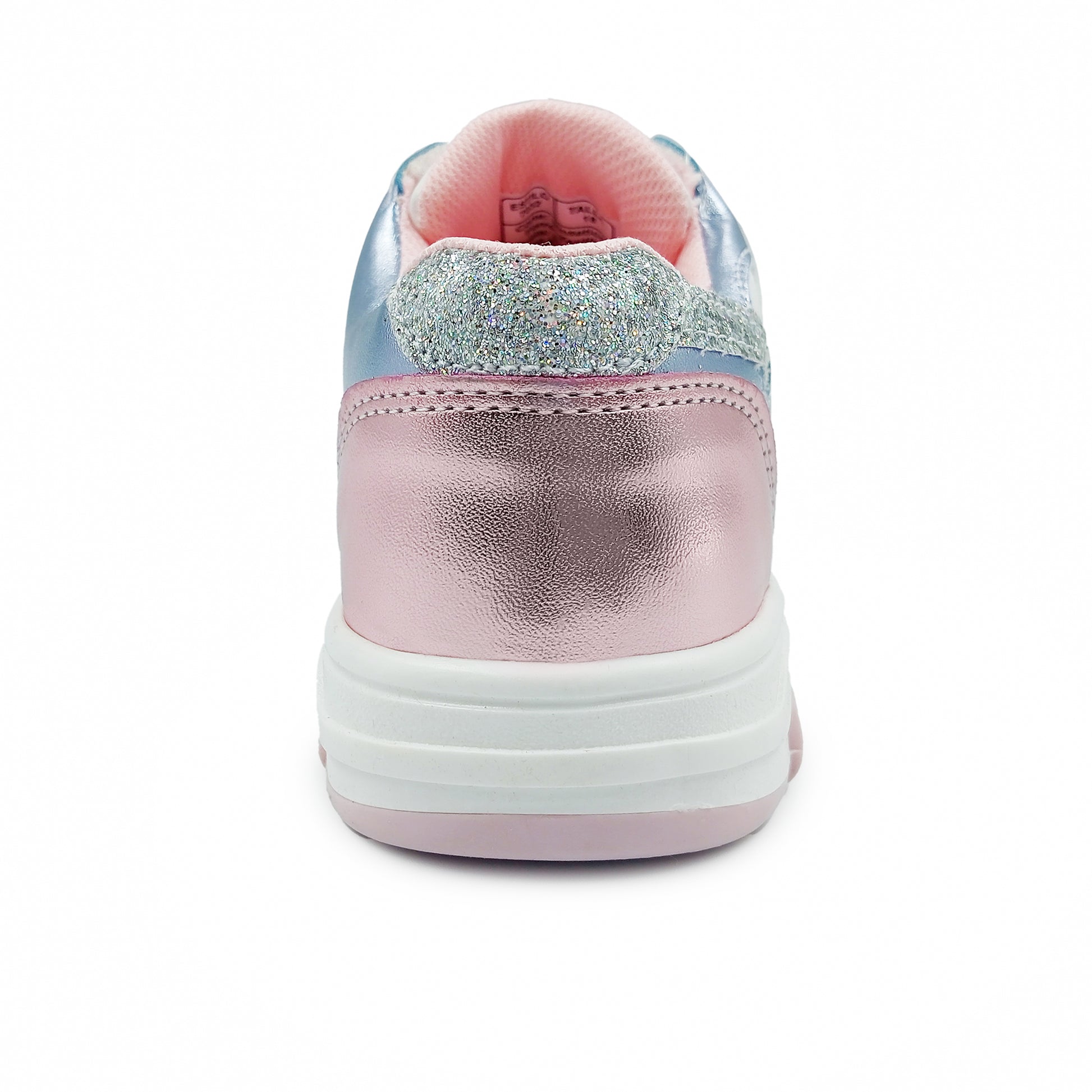 Tenis marca ANBADA para niña con figura de estrella a un costado en material holográfico plata, detalles en color azul y rosa metalizado.