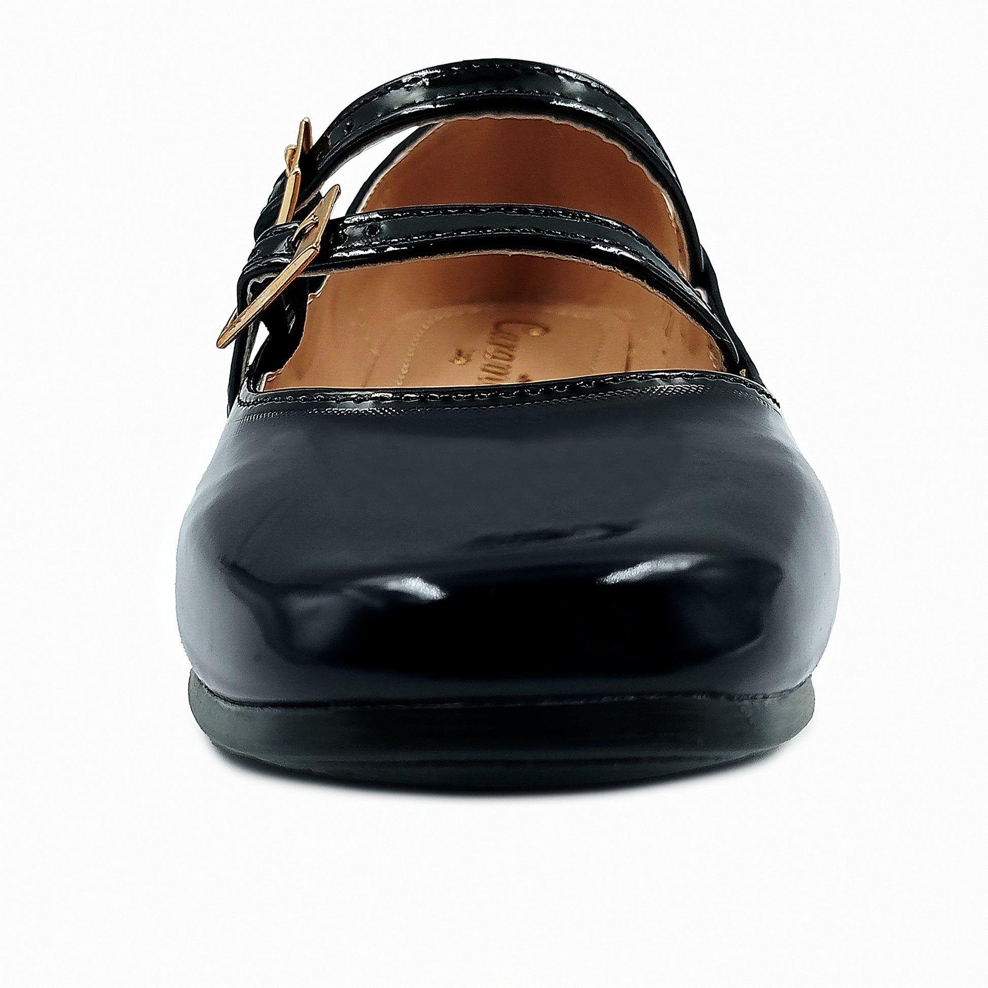 Zapatos marca CARAMEL para dama material charol, con correas ajustables y un tacón pequeño.